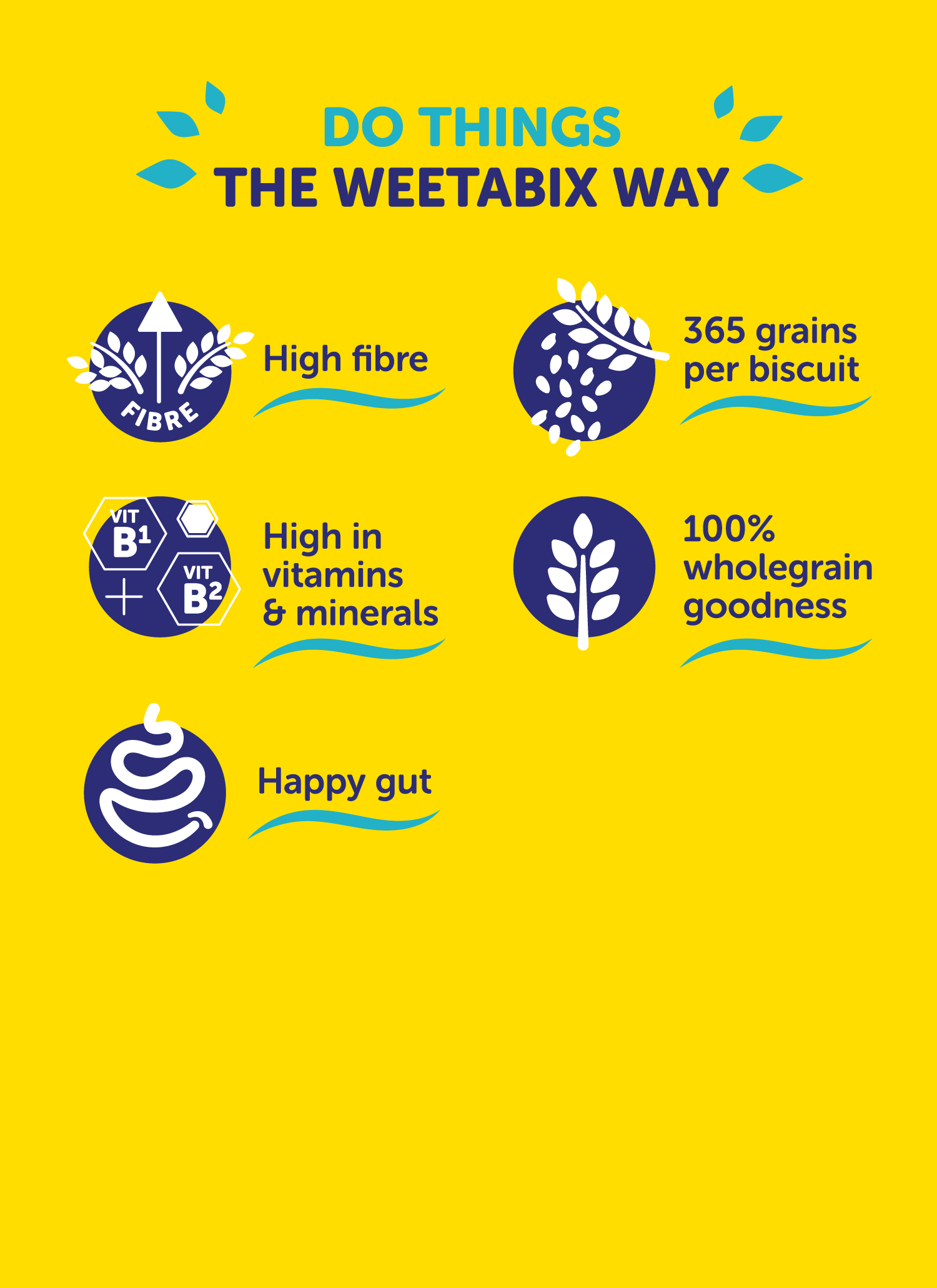 Wholegrain wheat is packed with super nutrients and we cram 365 whole grains in every single Weetabix! This only leaves room for a little malt extract, a pinch of salt, a dash of sugar and a boosting splash of minerals and vitamins to get your day off to a super start. It takes just two every morning to start noticing the difference!